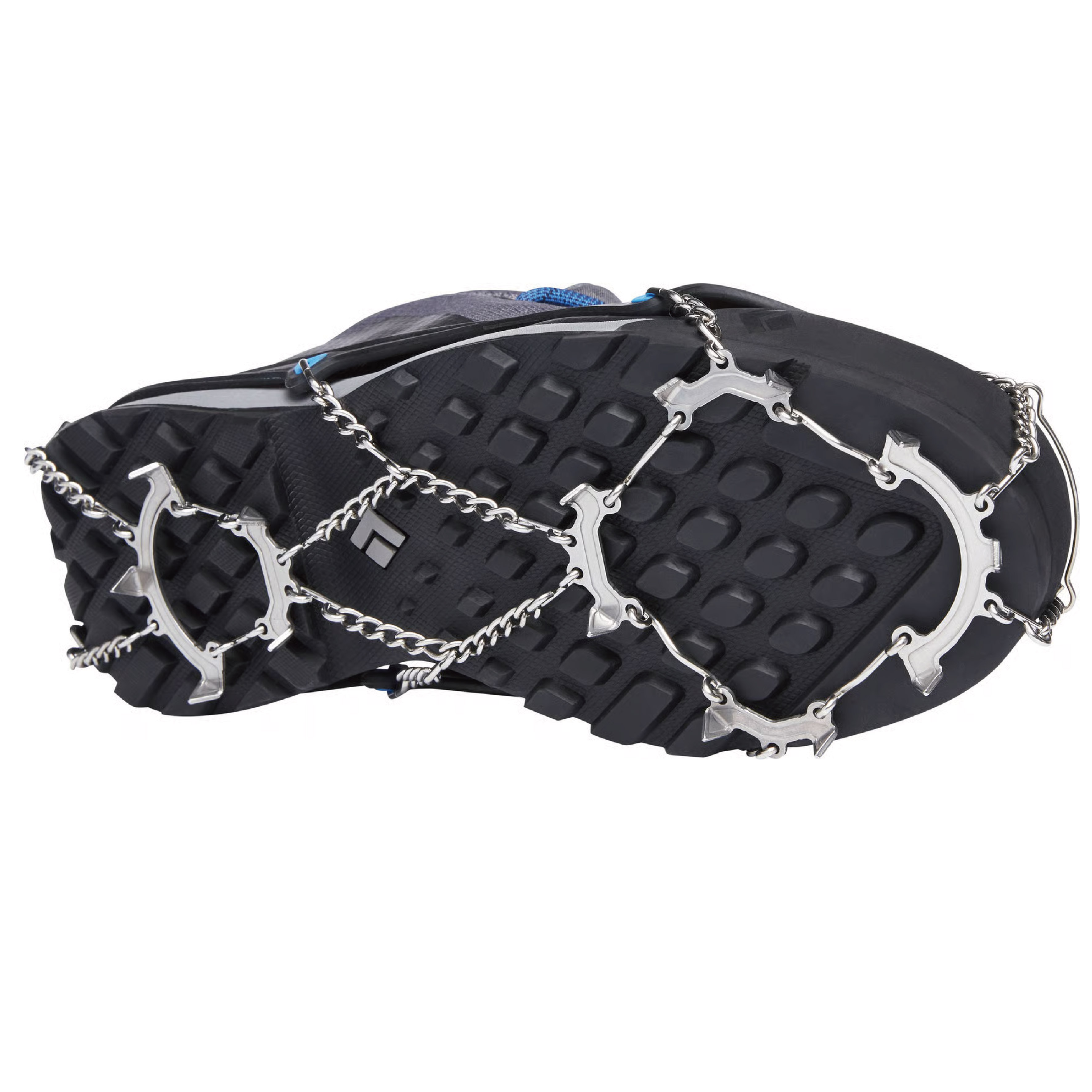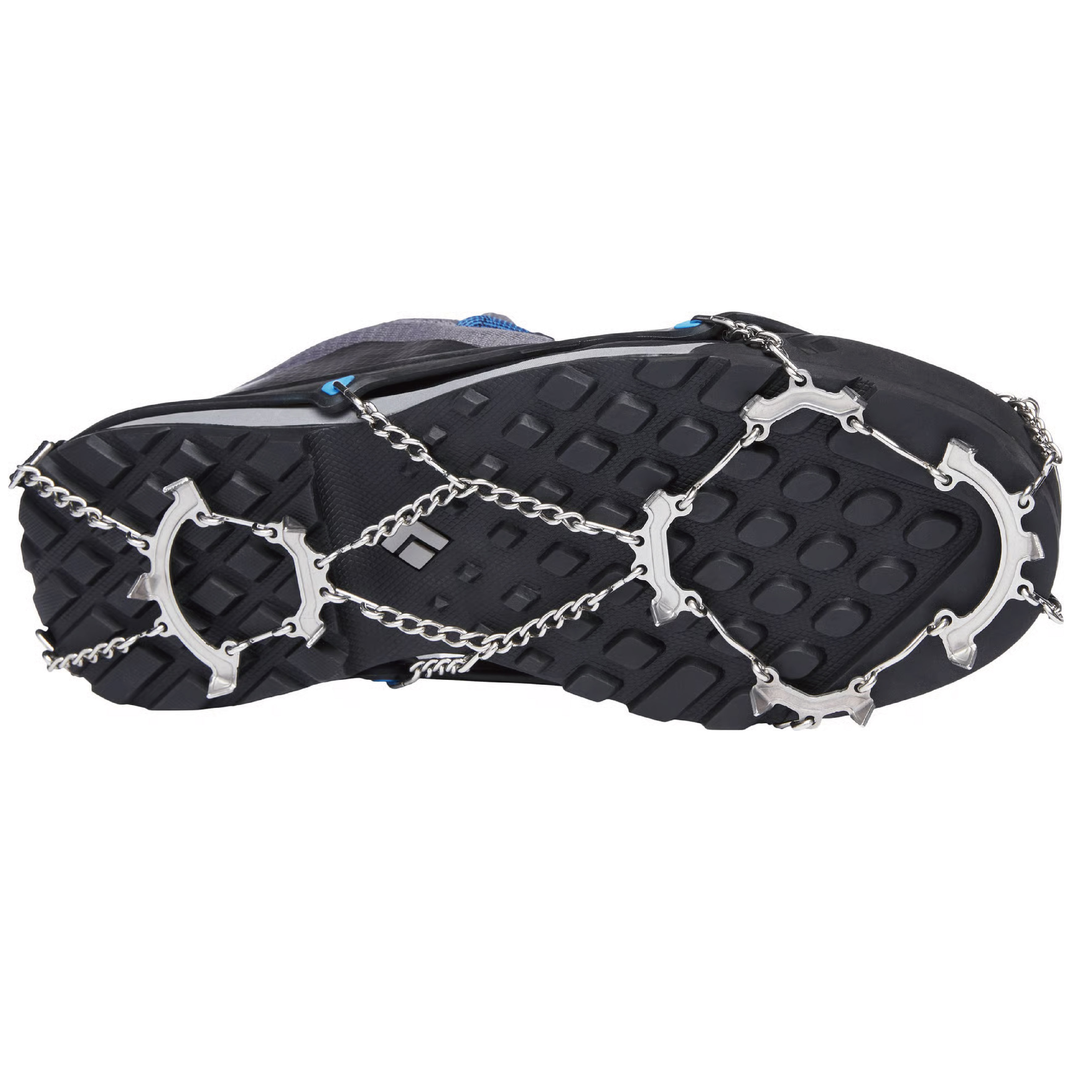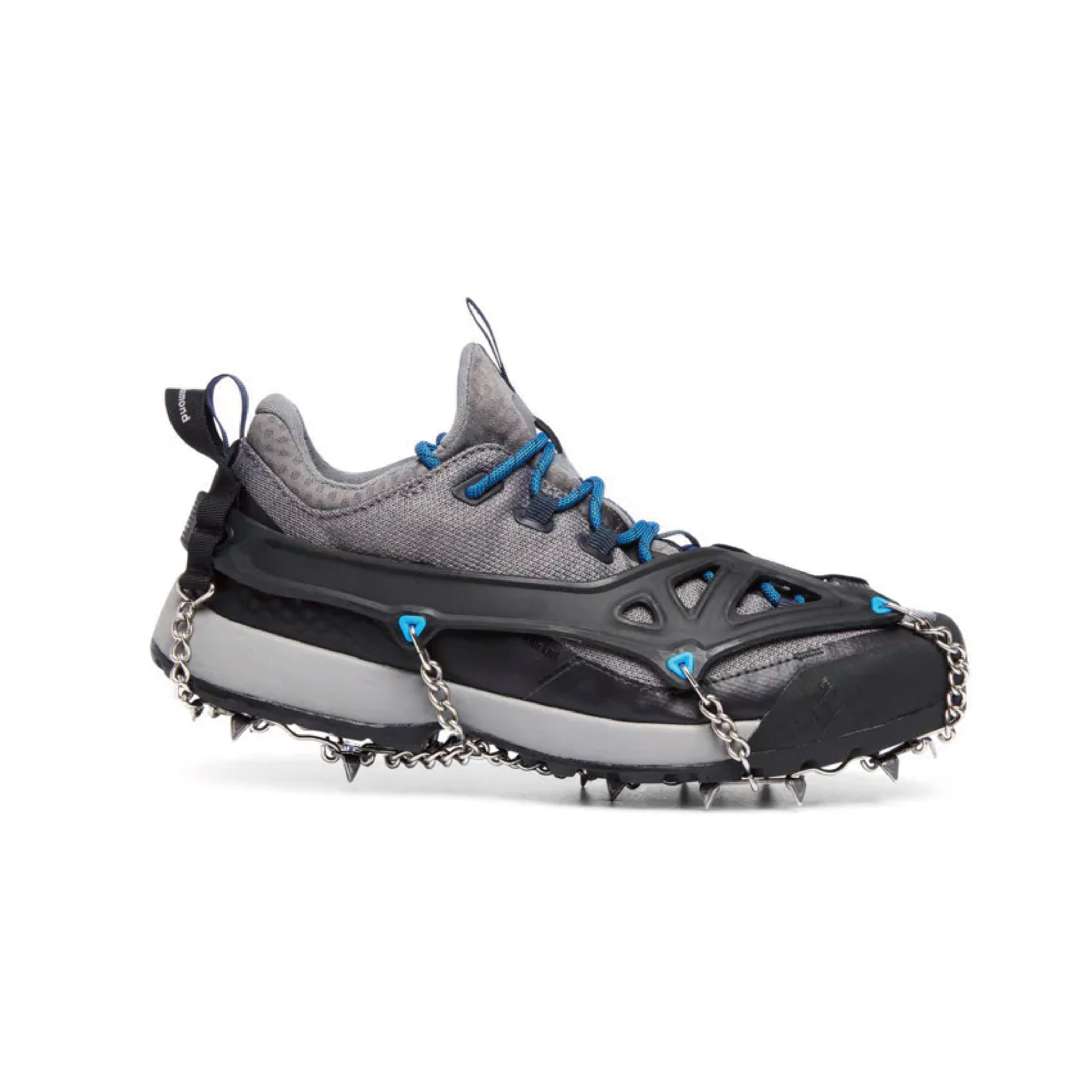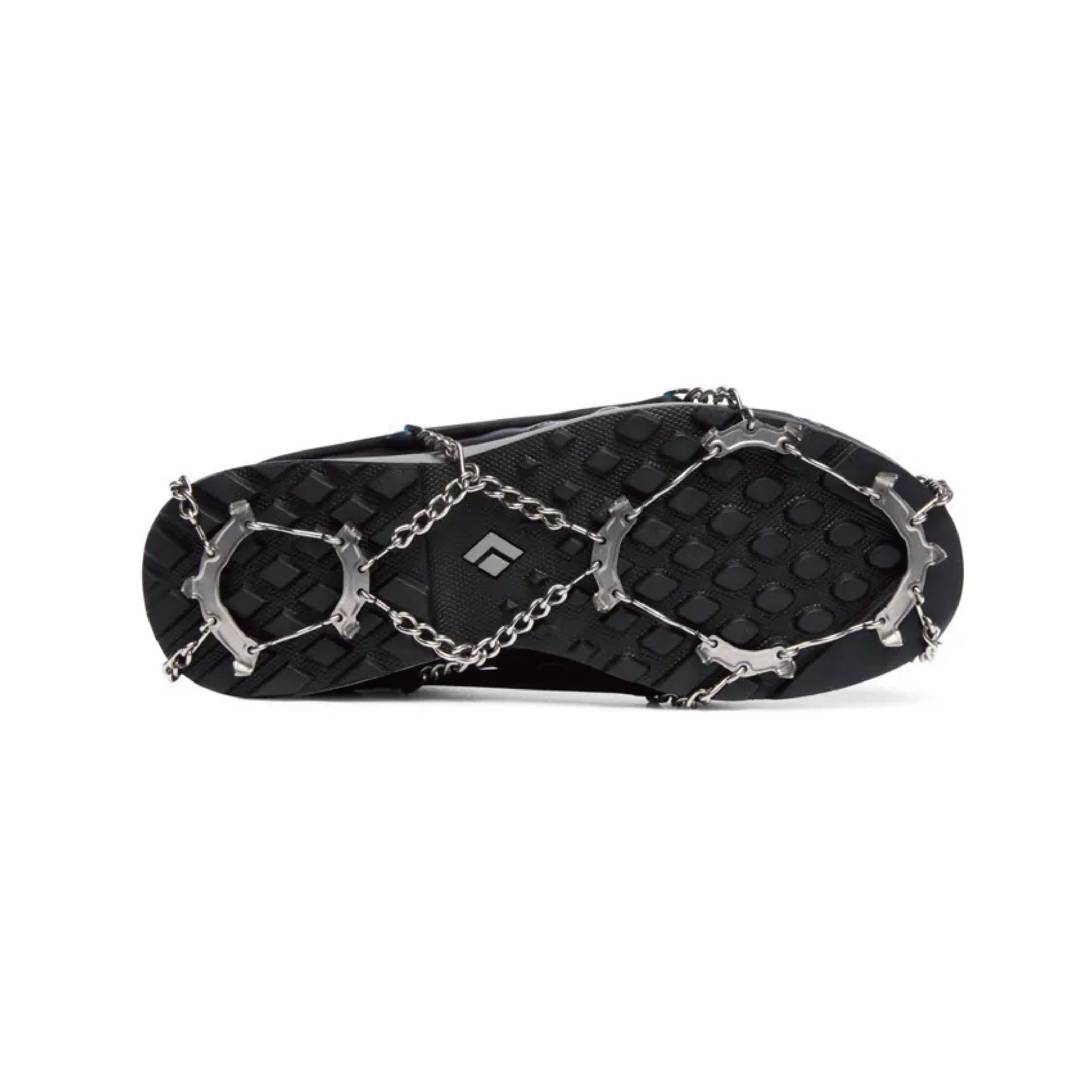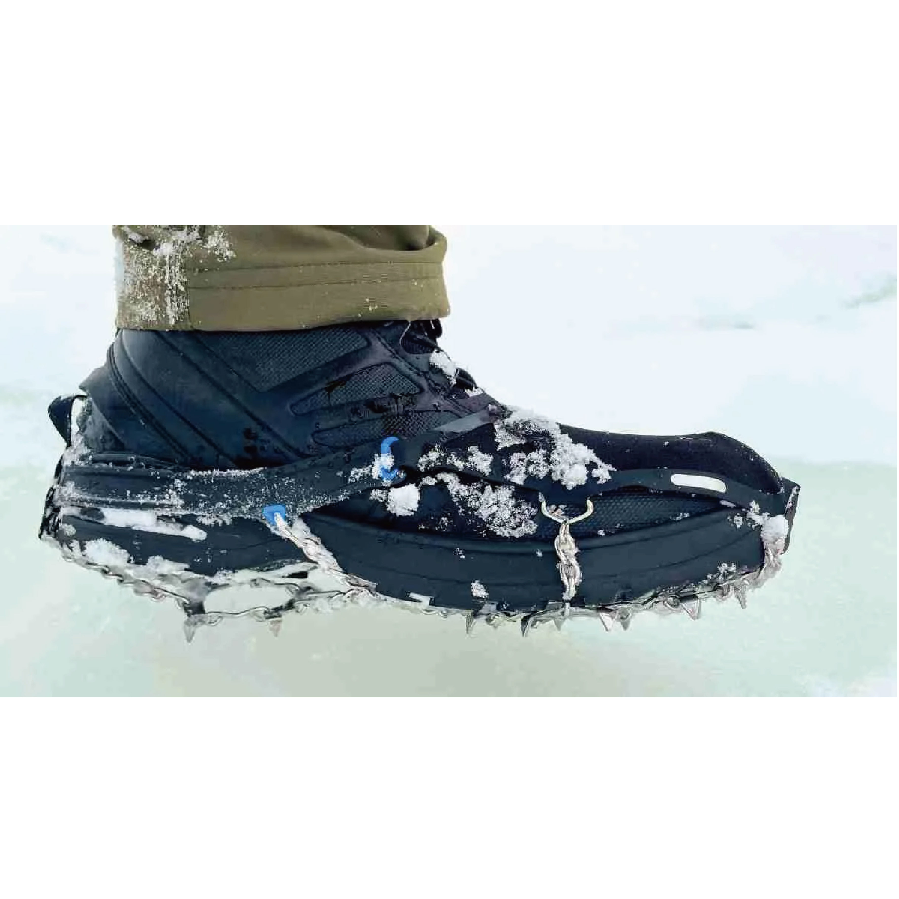 • 主體結構以鍊條式的設計,鞋底較軟的野跑鞋款也適用,較不易積雪造成鬆脫滑動。