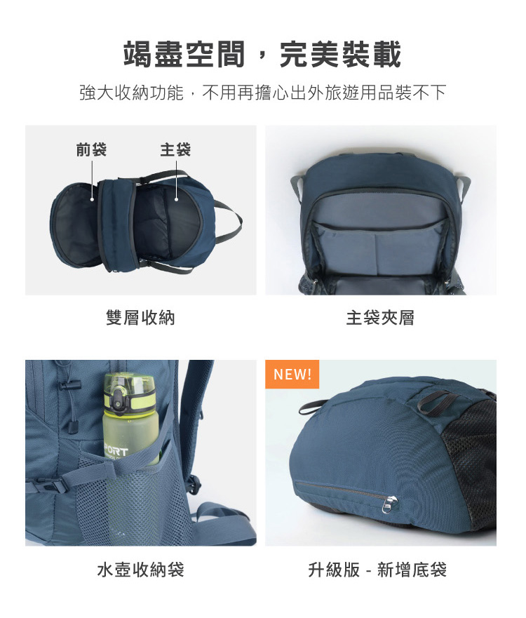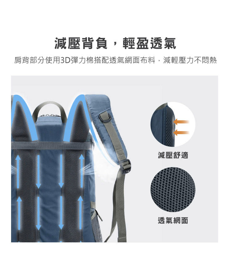 - 戶外旅行必備後背包,40L大容量設計,符合人體工學的最佳舒適度,背包採用防潑水透氣布料,肩帶彈力減壓,透氣舒適,親膚不悶熱。