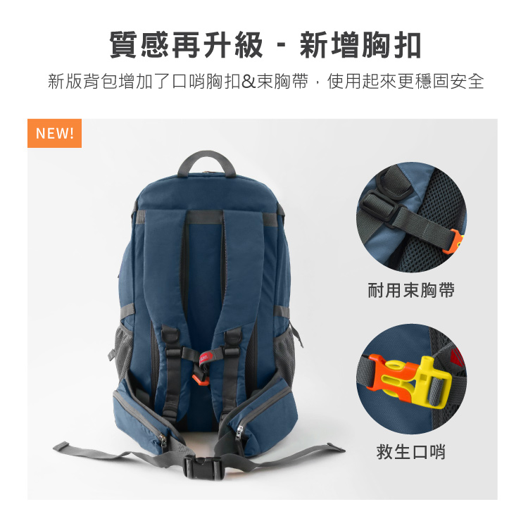 - ★終極版背包除了原有的救生口哨胸扣&束胸帶、防雨罩外新增腰邊側袋。