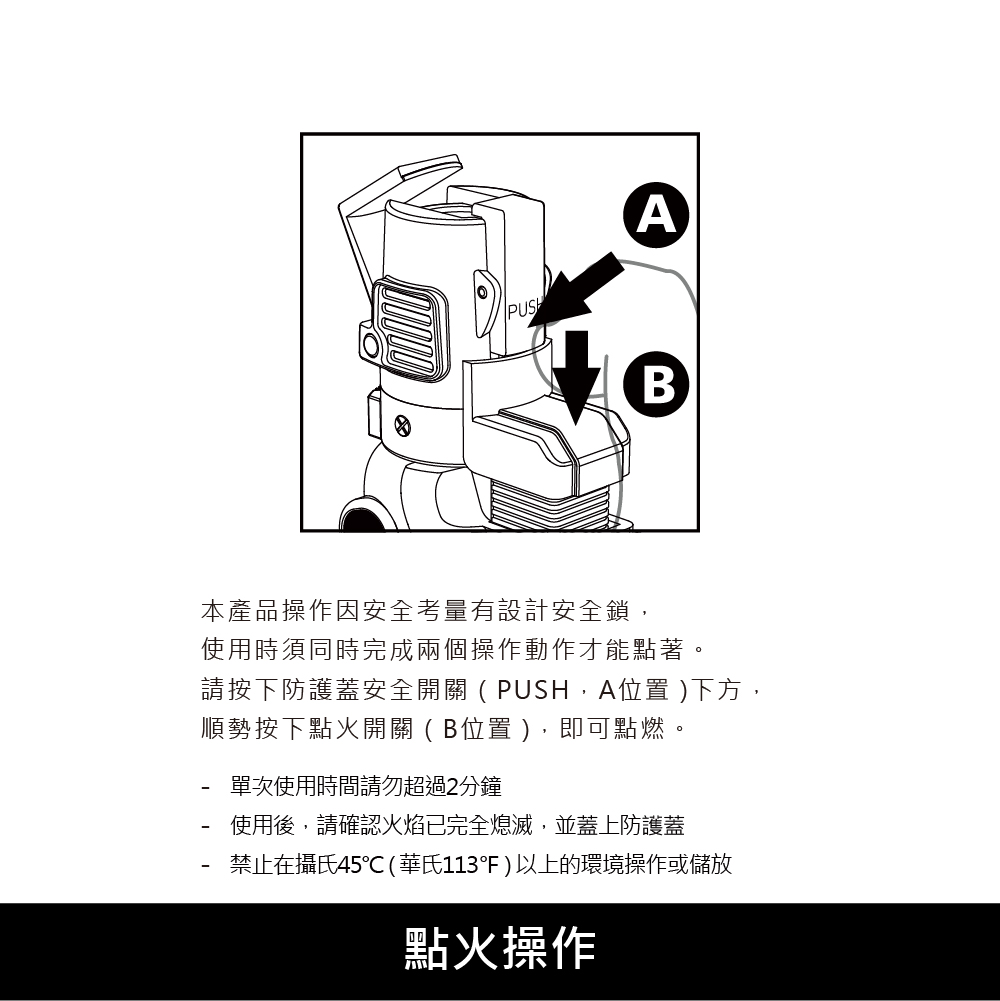 本產品使用高壓易燃氣體丁烷,請謹慎操作