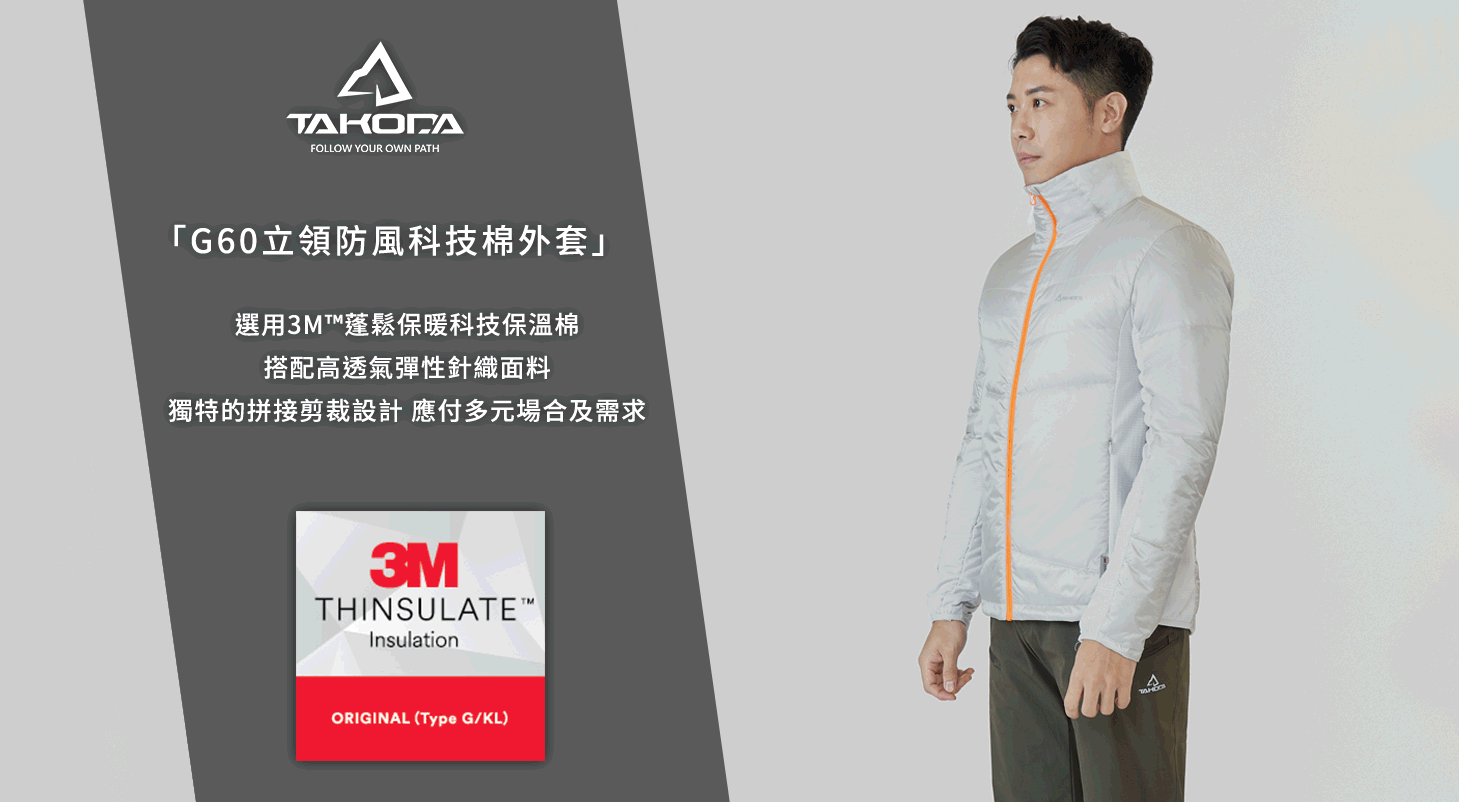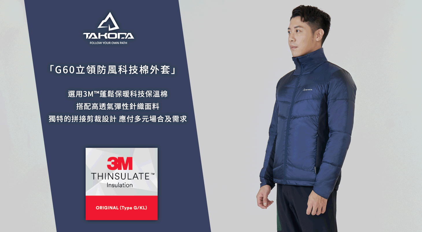 TAKODA Okaga G60輕量保暖科技棉立領外套 男款 雲灰色/深海藍