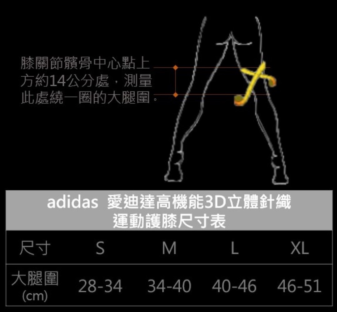 【尺寸測量方式】膝關節髕骨中心點上方約14公分處,測量此處一圈的大腿圍。